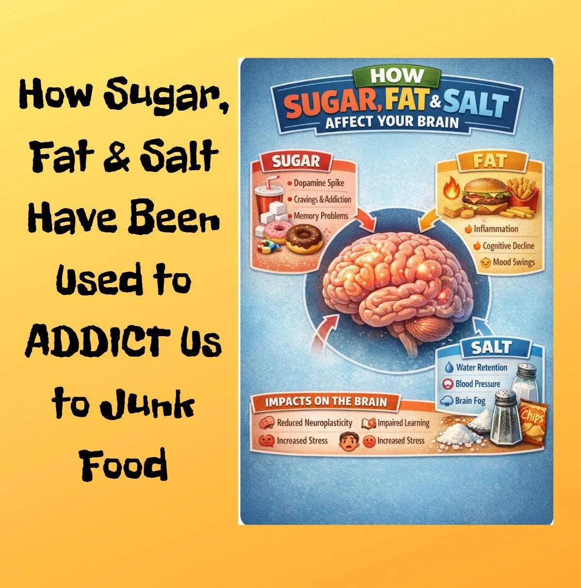 What if our struggle with junk food isn’t a failure of willpower, but the result of brains that have been quietly rewired? Let’s explore how sugar, fat, and salt are engineered to hijack our brain’s reward systems,much like addictive substances, driving cravings, weakening self-control, and increasing our risk for chronic disease and even dementia. If you’ve ever wondered why knowing better doesn’t always lead to eating better, this piece uncovers the neuroscience behind our food choices,and why understanding it may be the first step toward protecting both body and brain.